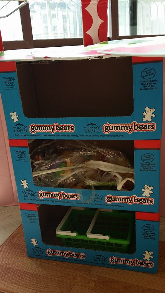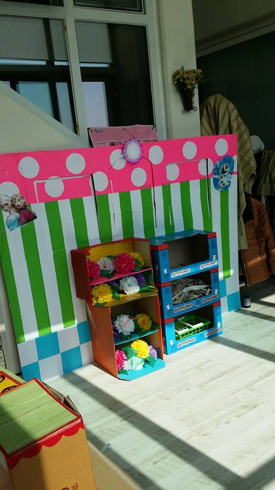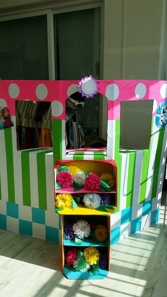 Another math station: a cardboard flower / grocery shop. The boxes in the “store” hold up the shutters and hold the extra merchandise. It folds up flat for storage. The window shutters close with velcro.