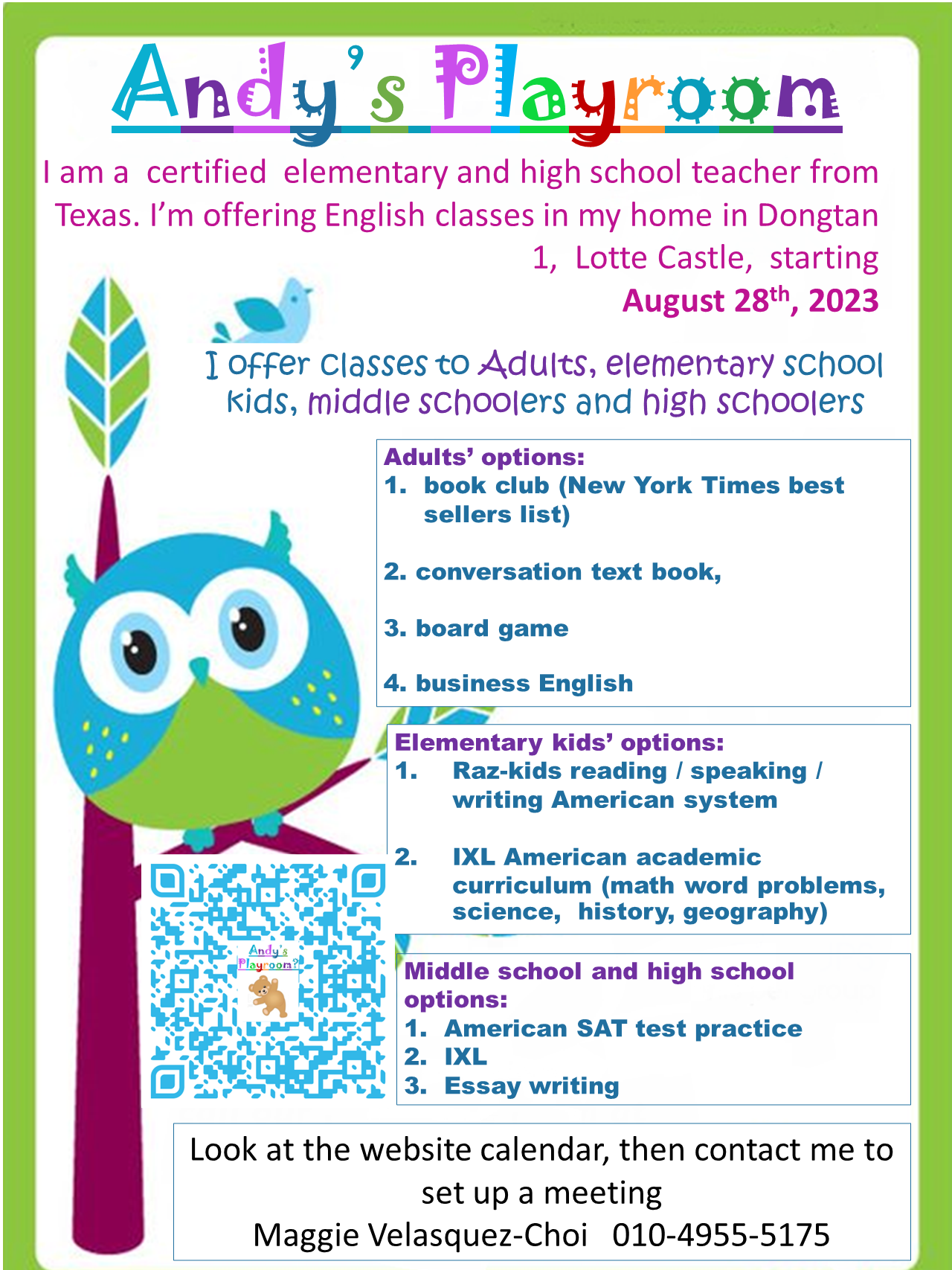 Hi. I am Andy’s mom, Maggie. I am a Texas certified elementary and high school teacher from Texas. I’m offering English classes in my home in Dongtan 1, Lotte Castle, starting August 28th, 2023. **************************************************** *********